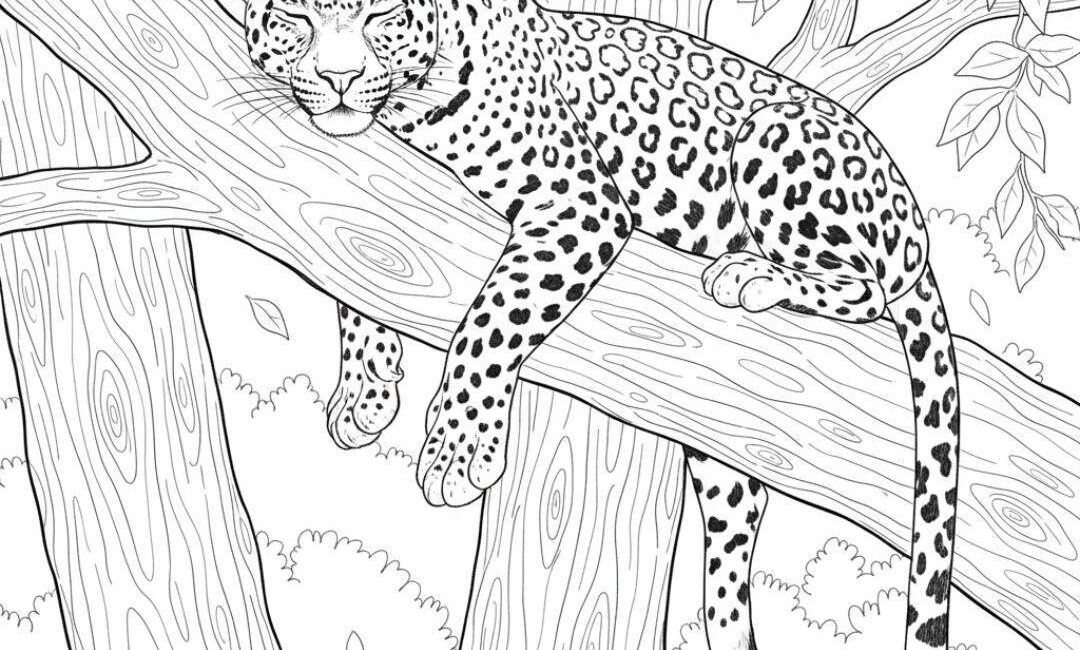 À première vue, l’image semble simple. Presque reposante. Un grand félin tacheté est allongé sur une branche, les yeux fermés, parfaitement détendu. Les lignes sont douces, répétitives, presque hypnotiques. Rien ne paraît anormal. Et pourtant, quelque chose se cache là, juste sous vos yeux.